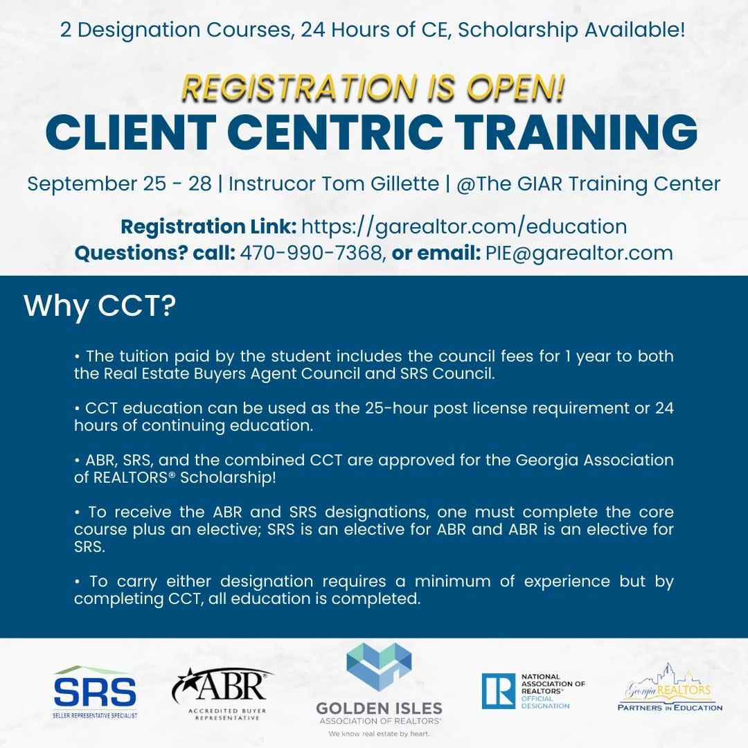 The Client-Centric Training (CCT): This 4-day course combines the 2-day ABR Core Course & the 2-day SRS Core Course. When you register for the 4-day CCT course you receive a discounted price. When you successfully complete the CCT course, you will earn either 24 hours of Georgia Continuing Education (CE) credit (#63529) OR 25 hours of Georgia Salesperson Post-License credit (#63528). When you register, you will indicate your credit choice. (In-class exam required - passing score of 75% or higher for Sales Post-License credit.)