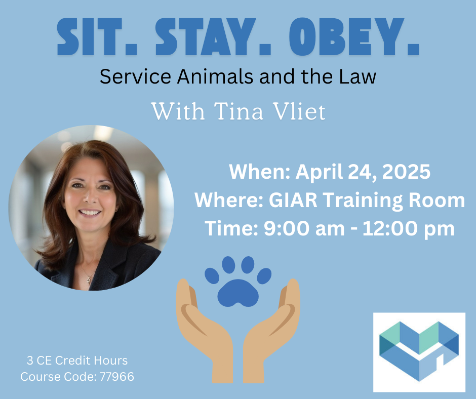 Register today for Sit. Stay. Obey: Service Animals and the Law with Tina Vliet!